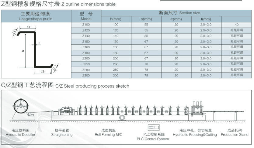 經該機輥軋的c型檁條成品具有良好的抗彎抗壓性能,平直度好、全自動定長切割、自動沖孔、自動化程度高,安裝快捷方便。 產品可作為大中型工業(yè)民用建筑的主體受力結構,如廠房、 倉庫、機車庫、飛機庫、展覽館、影劇院、體育場館、集市花棚的屋面承重荷載和墻面支撐。